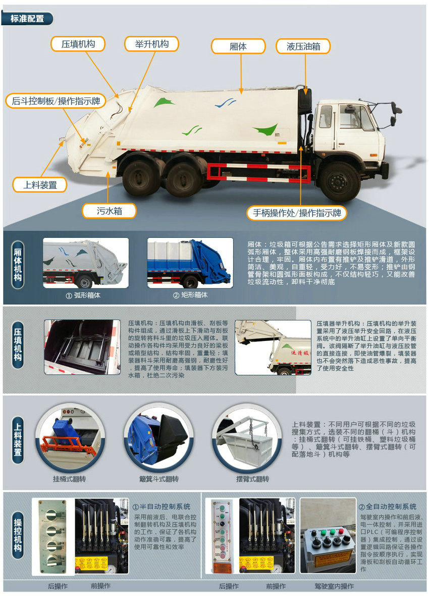 1、隨底盤選裝駕駛室,該車僅選用3300,3800軸距底盤。2、后部翻轉(zhuǎn)樣式選裝垃圾斗裝置,并選裝無后翻轉(zhuǎn)機構(gòu)。選裝無后翻轉(zhuǎn)機構(gòu)時該車總長(mm)/軸距(mm)/后懸(mm)的對應關系為:6950/3300/2205;7450/3800/2205。選裝垃圾斗機構(gòu)和掛桶機構(gòu)時該車總長(mm)/軸距(mm)/后懸(mm)的對應關系為:7150/3300/2405;7650/3800/2405。3、防護材料:Q235碳鋼,連接方式:左右側(cè)面防護采用焊接連接在副梁上,后部防護由專用裝置代替豁免。4、車輛顏色、文字噴涂及局部細節(jié)可變化。5、ABS生產(chǎn)廠家;東科克諾爾商用車制動系統(tǒng)(十堰)有限公司,型號:3631010-C2000。6、發(fā)動機與油耗值對關系為(L/km): CY4BK251/17.9; EQH140-52/17.8; YC4S130-50/17.6。