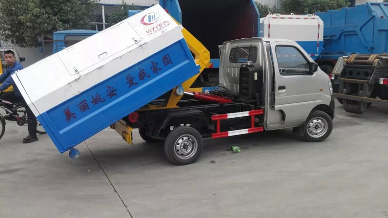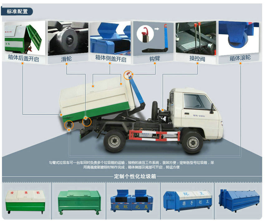 標準: 車廂可卸式垃圾車:廣泛適用于城市街道學校垃圾處理,可一車配多個垃圾廂,各個垃圾點放置多個垃圾箱,帶自卸功能,液壓操作,傾倒方便。
