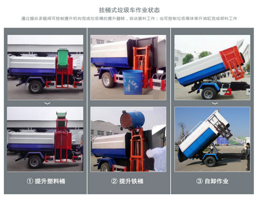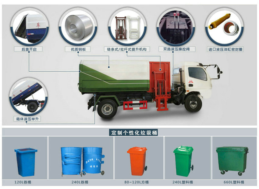 標(biāo)準(zhǔn): 掛桶式自裝卸垃圾車:采用鏈條和液壓油缸聯(lián)動(dòng)裝置,實(shí)現(xiàn)對(duì)垃圾桶提升和翻轉(zhuǎn),將多處垃圾桶內(nèi)的垃圾自動(dòng)收入車廂內(nèi),并到目的地一次性自卸出來。