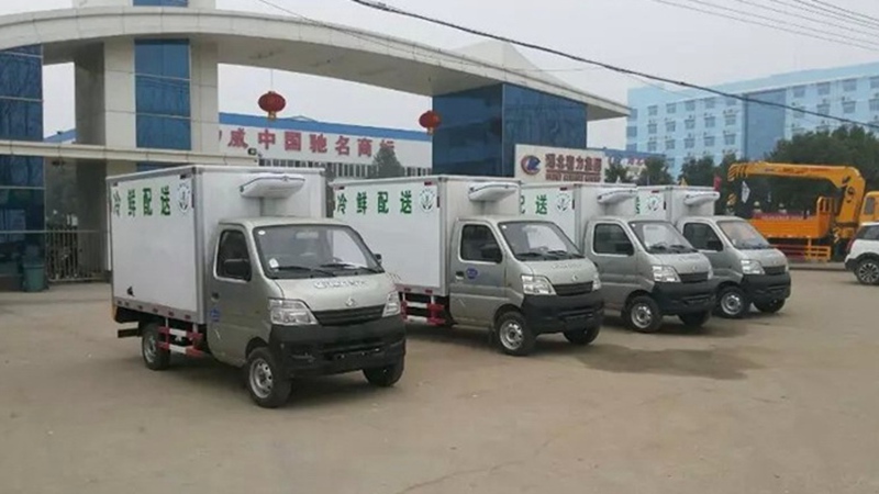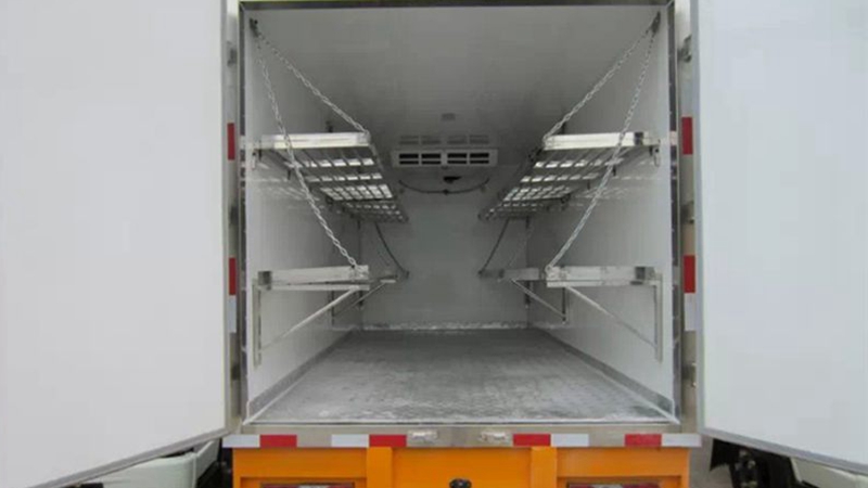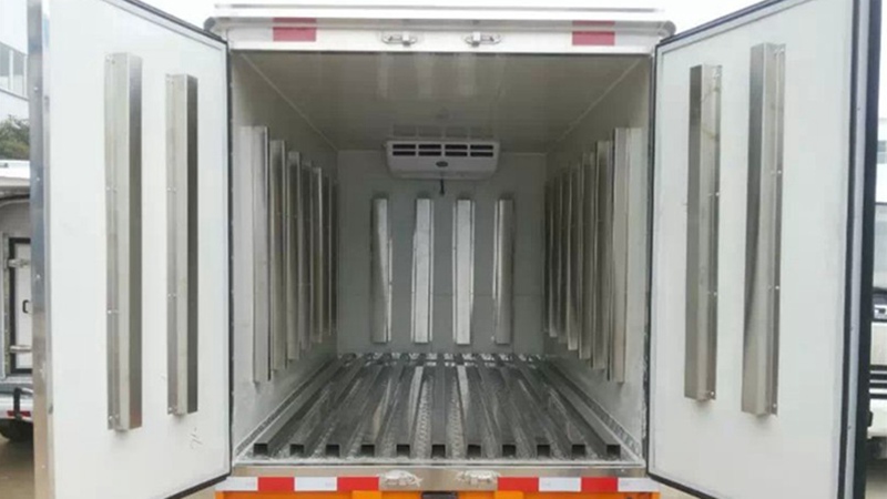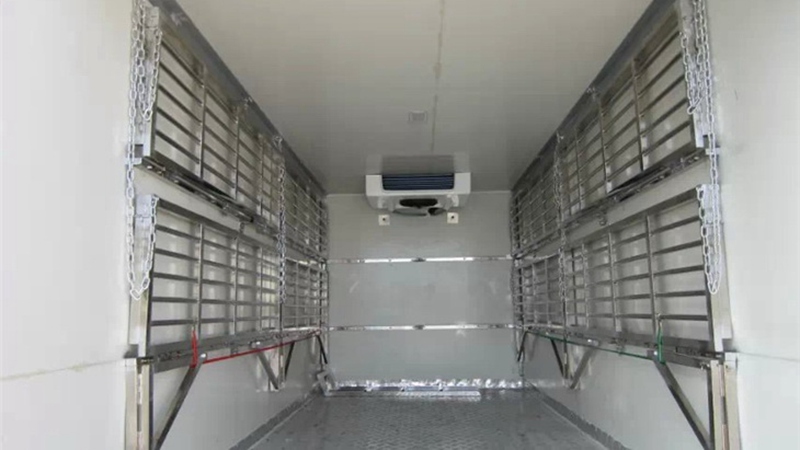 標準: 冷藏機組有美國開利,冷王,韓國大廣,宇大,華泰,漢雪等全球知名品牌,內外玻璃鋼,保溫層厚8CM,標配三道導軌,可另選加裝導軌、肉鉤,可根據(jù)用戶要求設計隔艙及廂體開側門。